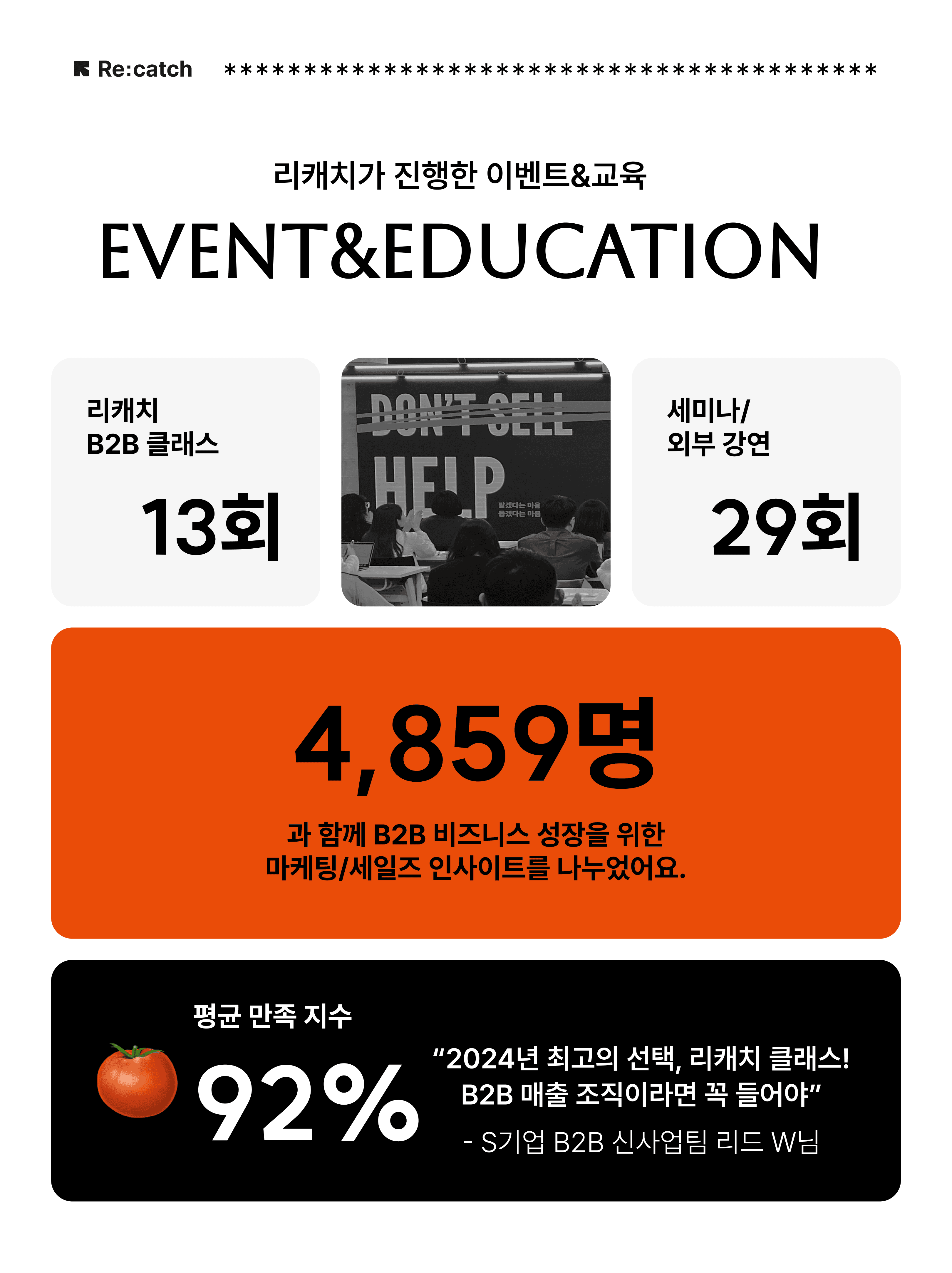 마케팅·세일즈 팀의 실무자부터, 대표님까지 4,859분이 함께해 주셨습니다. 평균 92%의 만족도를 자랑하는 리캐치 B2B 클래스와 세미나 및 외부 강연을 합쳐 총 41회의 이벤트에서 B2B 팀과 직접 만났습니다.