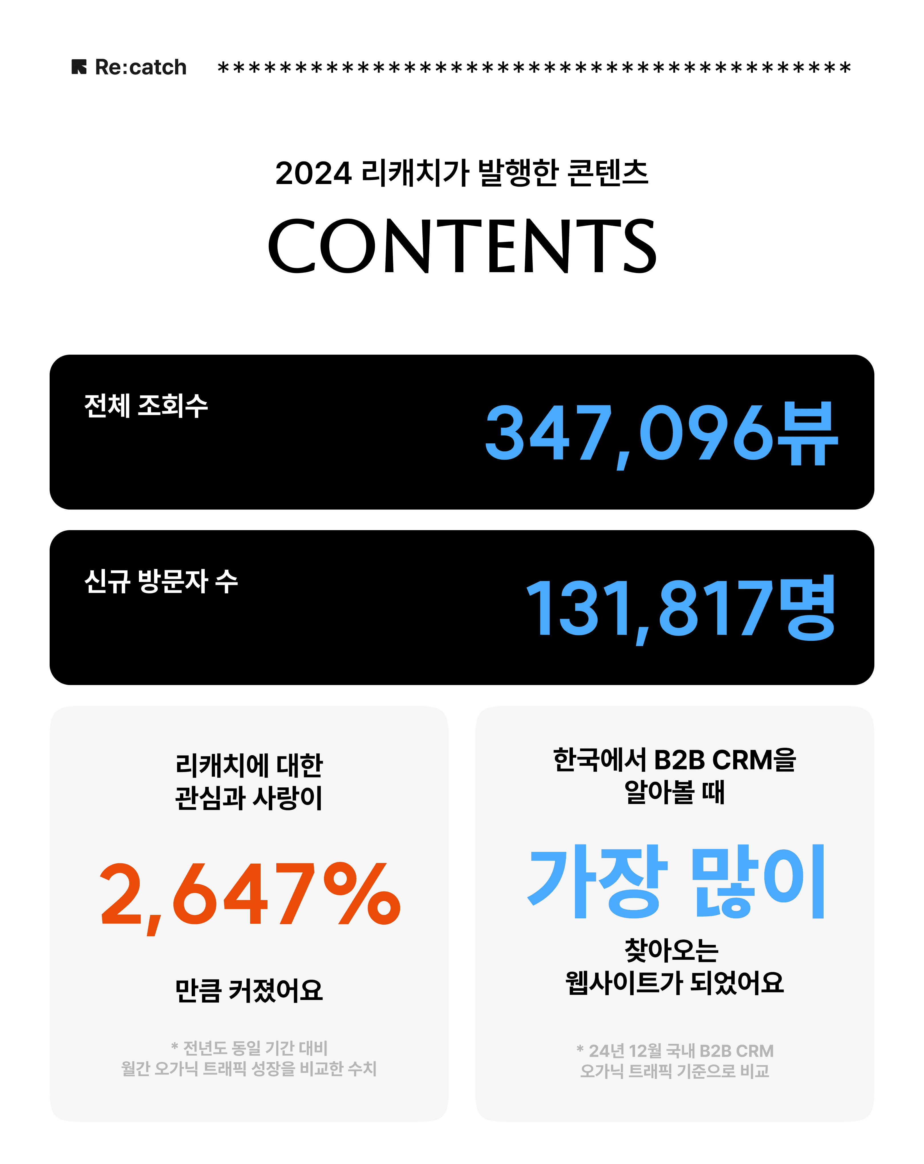 지난 한 해 동안 리캐치는 B2B CRM으로 도약하며, 마케팅·세일즈 팀이 더 적은 리소스로 더 많은 성과를 달성할 수 있도록 하기 위해 노력해왔어요. 그 과정에선 무엇보다도 여러분의 관심과 신뢰가 큰 힘이 되었습니다.