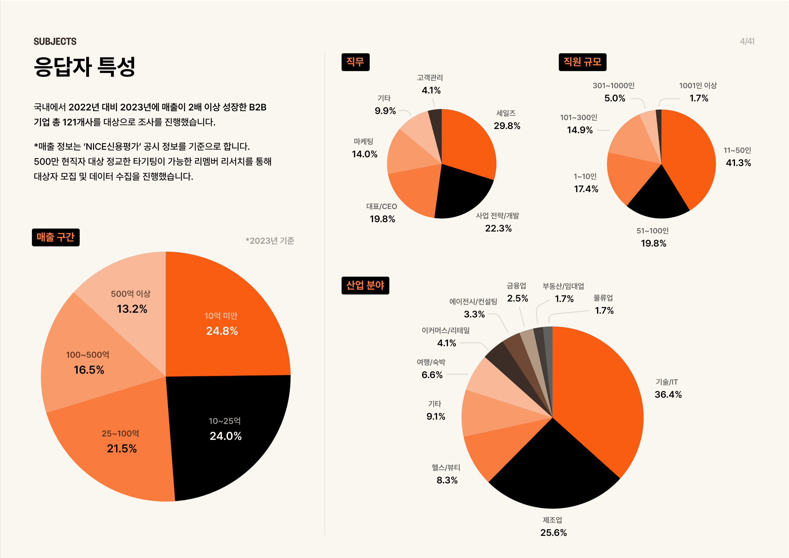 이번 리포트북 응답엔 도합 매출은 9조 원, 평균 증가액은 500억 원에 달하는 121개 기업이 함께해 주셨습니다. 한국 특성상 제조, IT업이 응답의 큰 비중을 차지하고 있지만, 그 외에도 다양한 분야에서의 매출규모 성장을 확인할 수 있었어요.