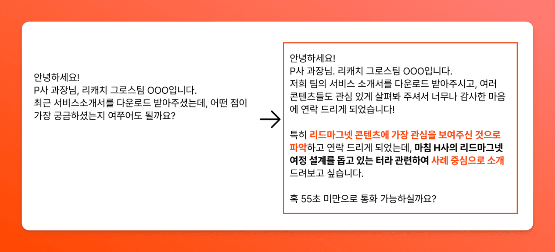 예를 들어, 잠재고객이 HR 디지털 전환 가이드를 열심히 읽었다면"어떤 HR 업무에 어려움을 겪고 계신가요?"가 아니라 "최근 비슷한 규모 기업에서 채용 프로세스 디지털화로 채용 기간을 40% 단축한 사례가 있는데, 현재 가장 시간이 오래 걸리는 HR 프로세스는 어떤 부분인지 궁금합니다" 라고 접근하는 거죠.
