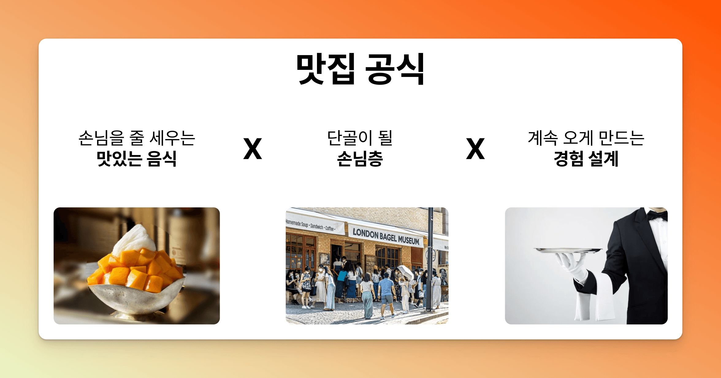 사람들의 발길이 끊이지 않는 맛집의 필수 조건으로 무엇이 있을까요? ‘맛있는 음식’, ‘단골 손님층’, 계속 찾아오게 만드는 ‘경험 설계’를 꼽을 수 있습니다. B2B 마케팅을 이 ‘맛집 공식’에 대입해보겠습니다.