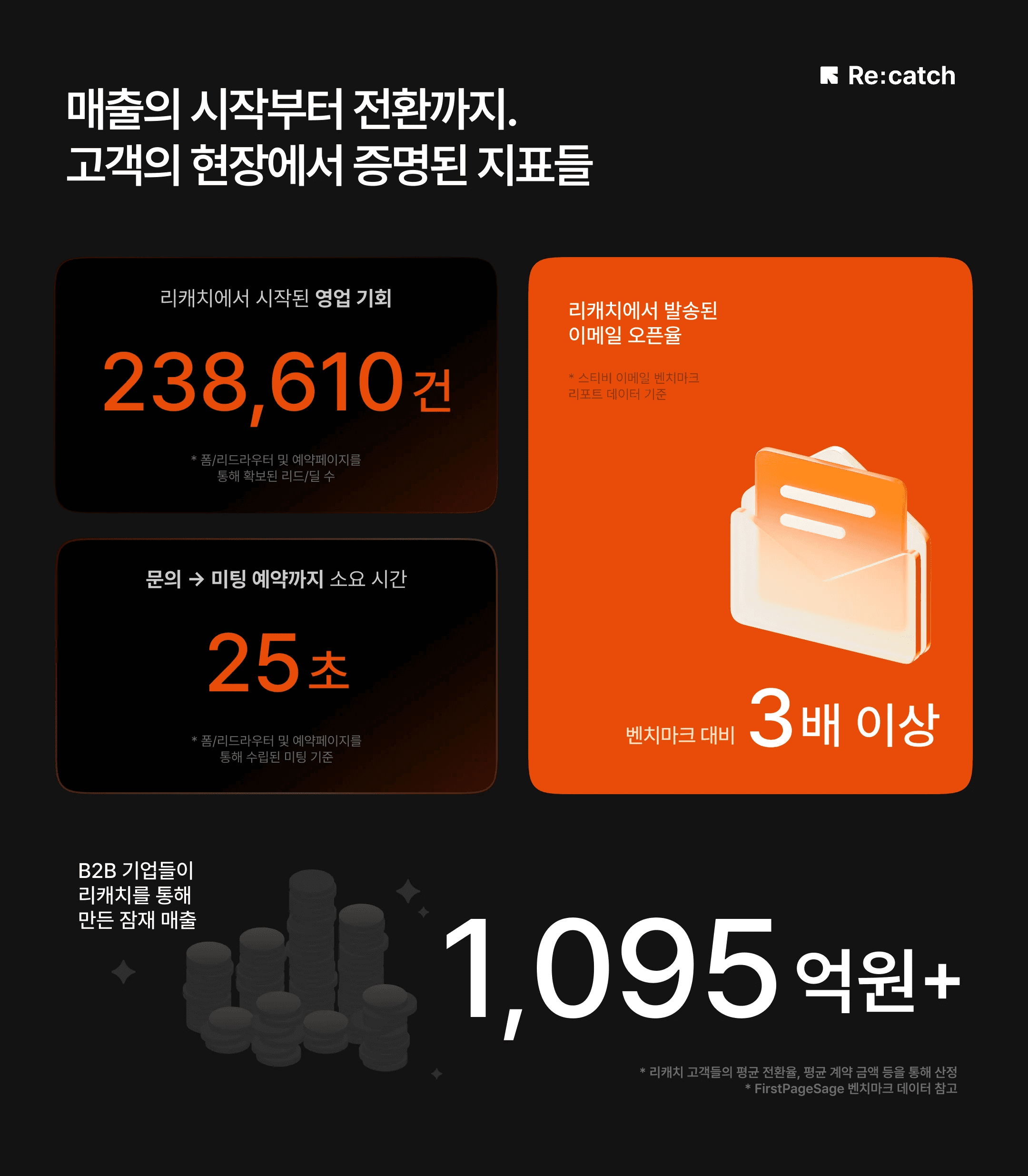 지금 이 순간도, 커피를 한 모금 마시는 시간마다 영업 기회는 새롭게 만들어지고 있어요. 이런 흐름이 모여, 리캐치를 통해 성사된 계약 규모는 잠재 매출 1,095억 원에 달합니다. 이 숫자는 파이프라인에 담긴 가능성이자, 고객들이 리캐치를 통해 만들어낸 성과입니다.