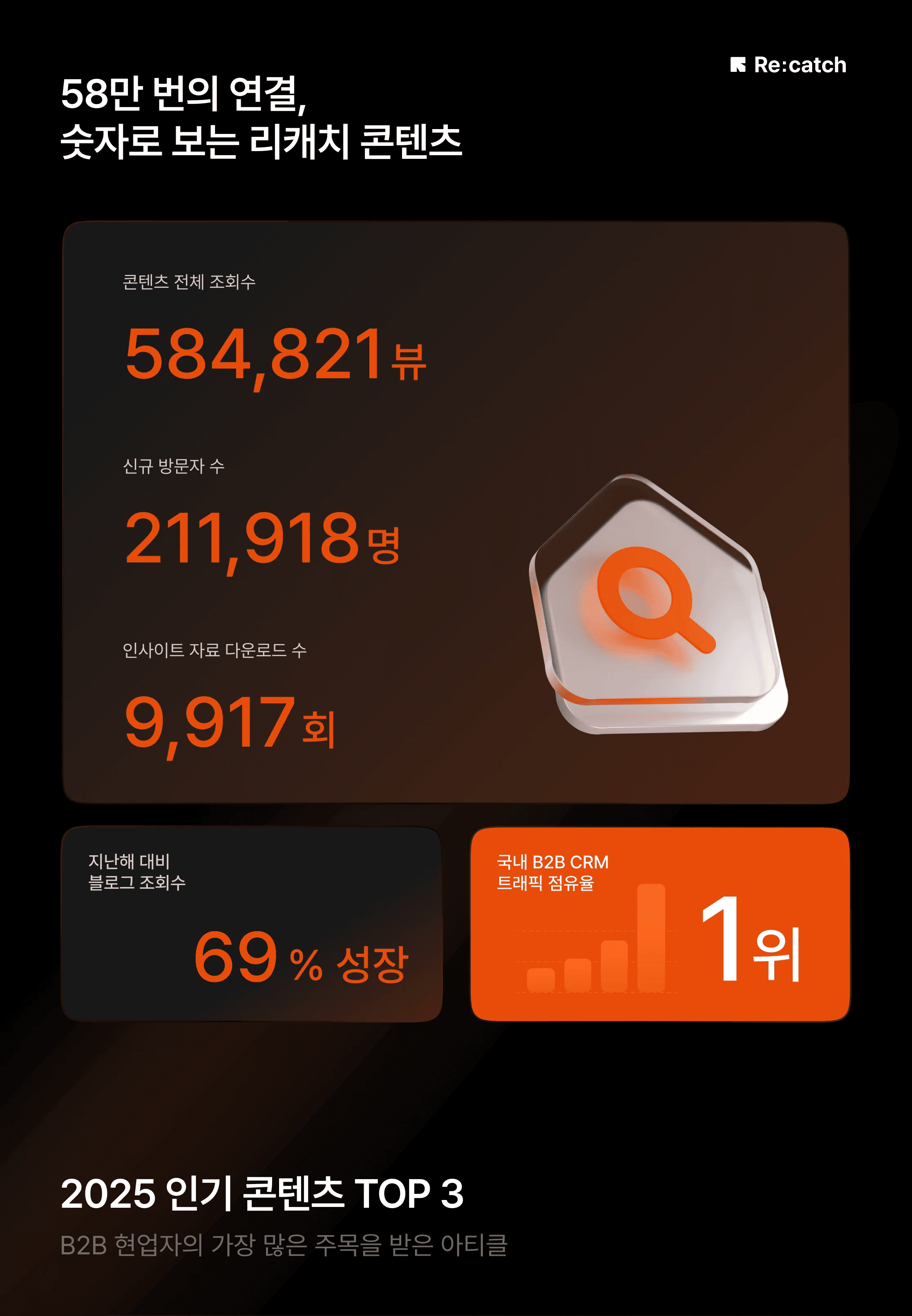 리캐치 블로그는 조회수 58만회, 신규 방문자는 21만명을 넘어서며, 국내 주요 B2B CRM 중 트래픽 점유율 1위를 기록했어요.