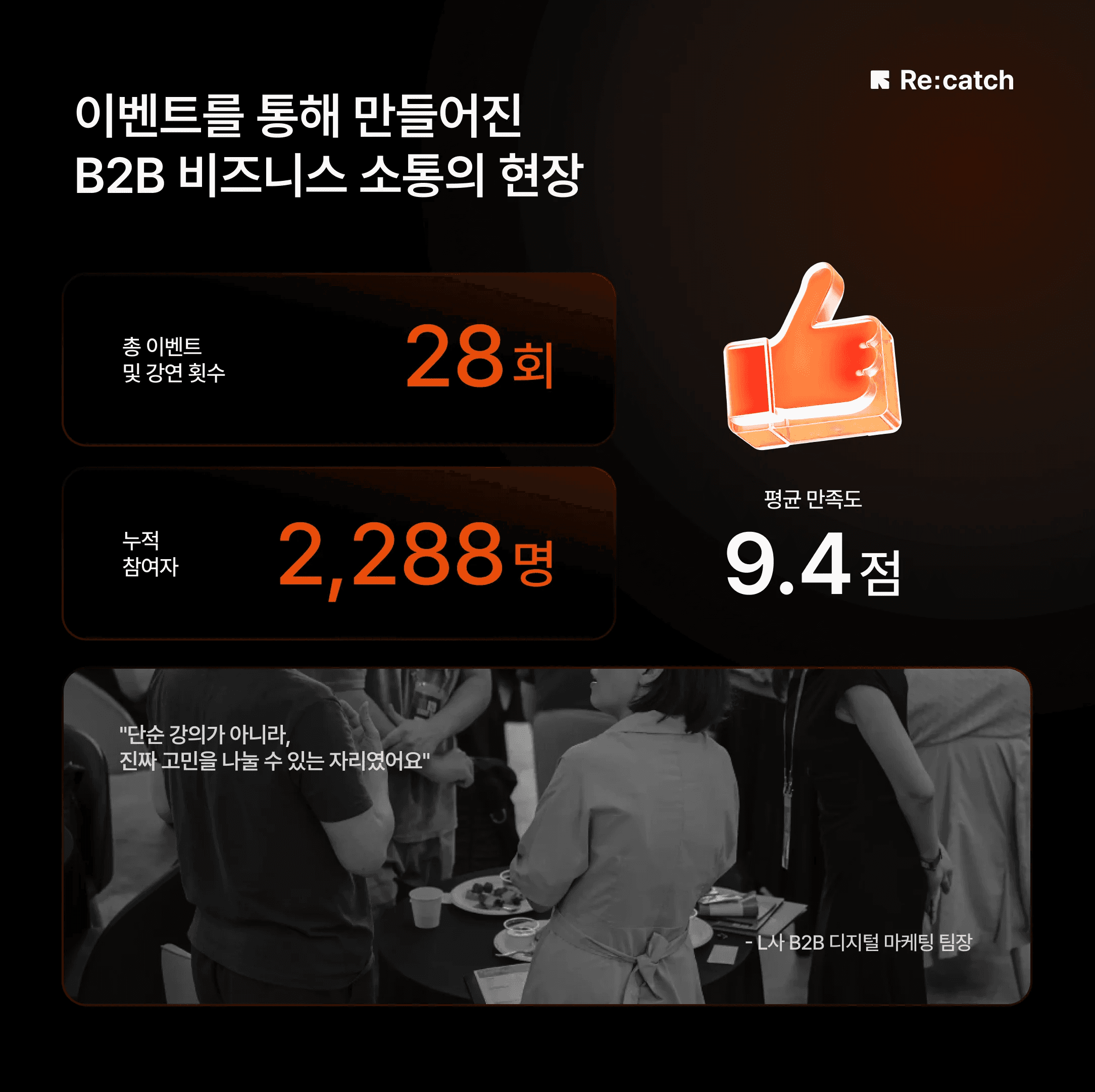 총 28회의 웨비나, 프라이빗 세미나, VIP 행사 및 강연 등을 통해 월 평균 2.3회, B2B 실무자와 리더들을 직접 만났습니다.