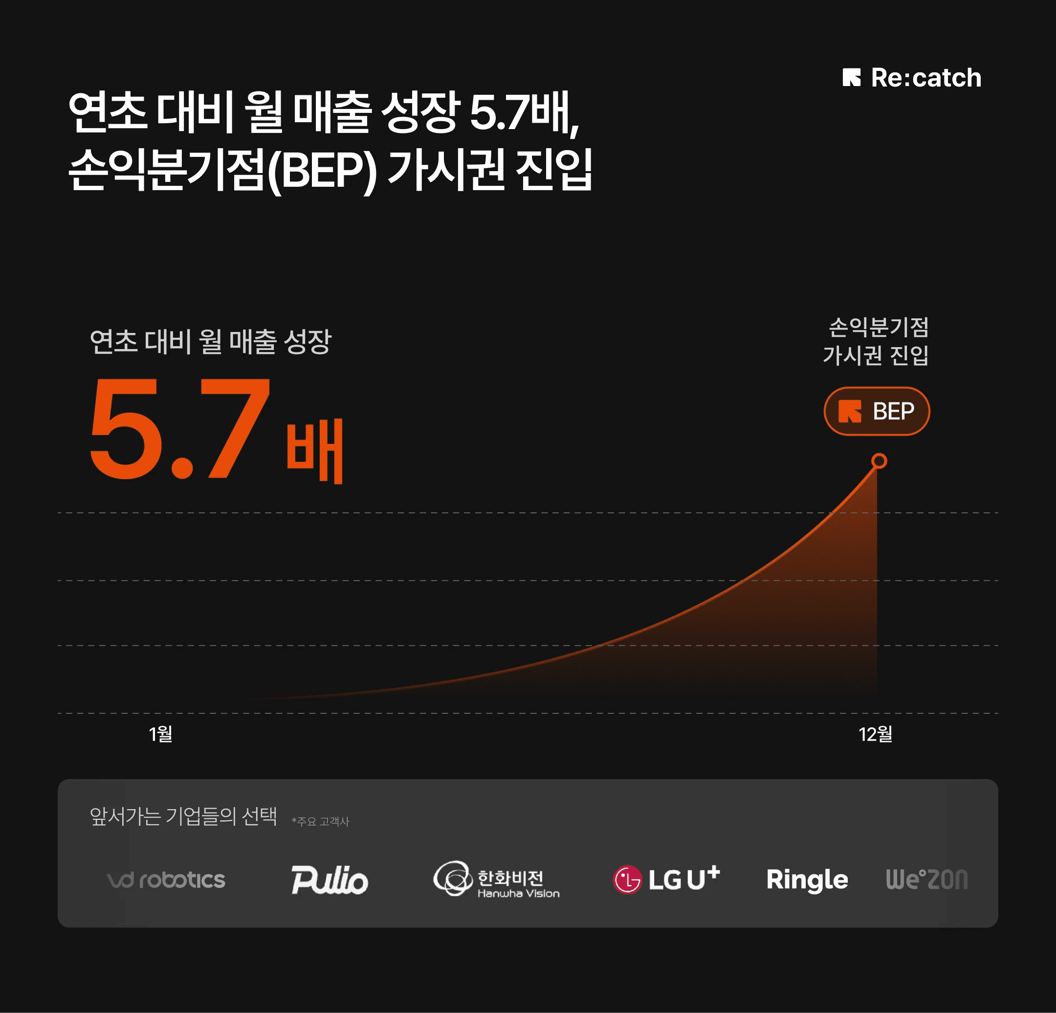 2025년, 리캐치는 연초 대비 실적 매출 5.7배 성장과 함께 손익분기점 가시권에 진입했어요.
