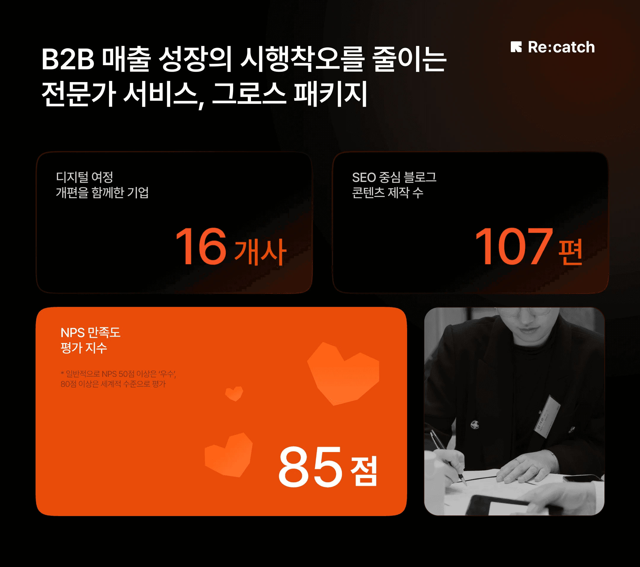 2025년 리캐치는 CRM ‘관리’ 이전 단계의 문제를 해결하기 위해 리드 생성에 집중하는 전문가 집단인 그로스랩을 중심으로, 그로스 패키지를 본격적으로 확장했어요. 일반적으로 50점 이상이 ‘우수'한 정도로 평가되는 NPS에서 무려 85점을 기록하기도 했습니다.